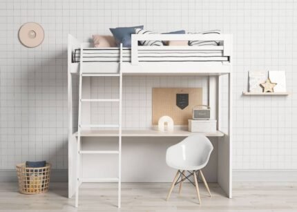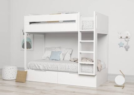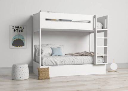 Children’s bunk bed with integrated railing and ladder and trundle drawers