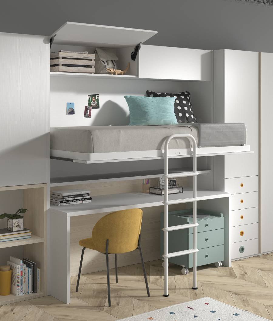 Youth bedroom with a folding bed with a slate surface, a study table and built-in wardrobes , encouraging youthful expression and organization
