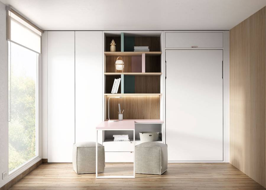 This bedroom appears to be for individual use until you open the vertical bed. With a gesture, this bed becomes a vertical bunk bed with a ladder that unfolds to attach to the lower bed frame . The upper bed is protected by a folding upholstered headboard , which also ensures the positioning of the mattress. On the other side of the bed, there is a series of shelves with sliding dividers and an L-shaped desk . The composition is completed by a floor-to-ceiling wardrobe with two doors.