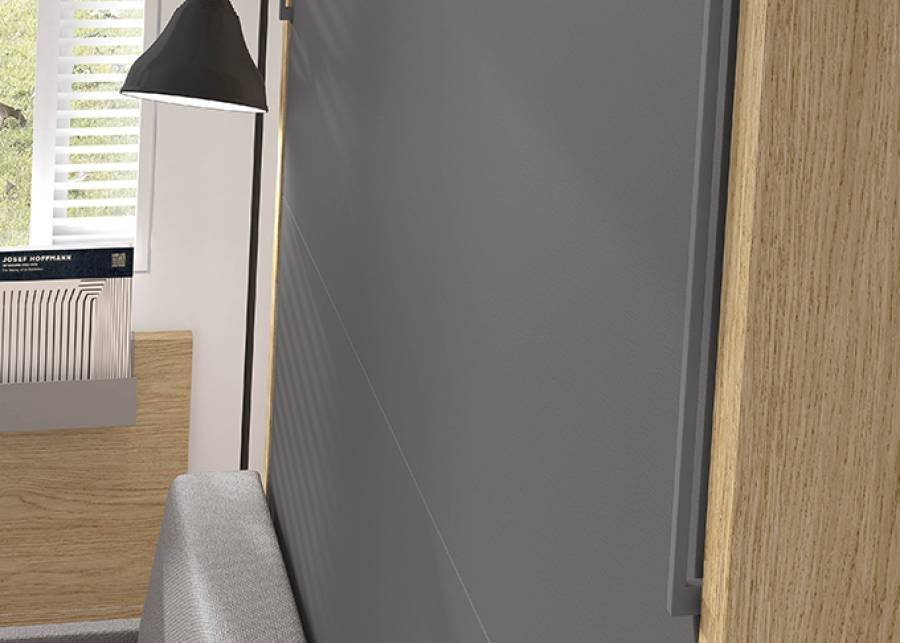 This hybrid composition allows for a double use of the room. Both as a living room and as a regular bedroom, this composition is ideal for small homes . This model corresponds to a horizontal folding bed with a sofa for a 135 x 190 mattress that opens very easily. The furniture is completed with bookcases and a low sideboard with drawers on which the television rests. The work area is made up of a suspended table with a lower panel that has been completed with a wainscoting panel to unify the finish of the entire wall.
