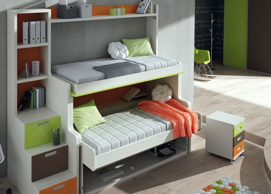Children’s bedroom with folding bed-table-bunk bed for 90×190 mattresses (in both cases).