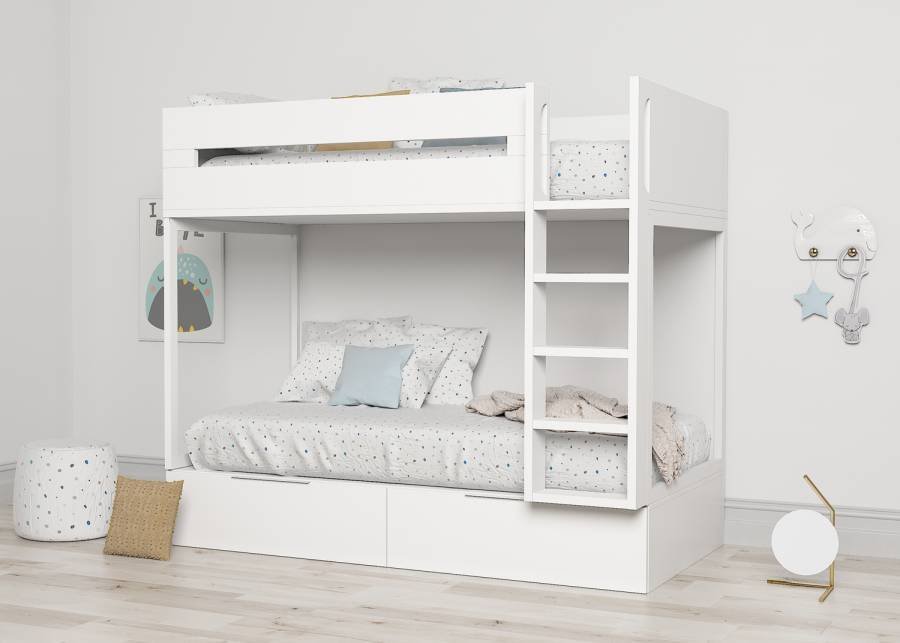 A perfect bunk bed for small spaces . Its base with two large containers provides extra storage that any mom or dad in the world will appreciate. The ladder and the guardrail are integrated into the bed structure itself, making it earthquake-proof.