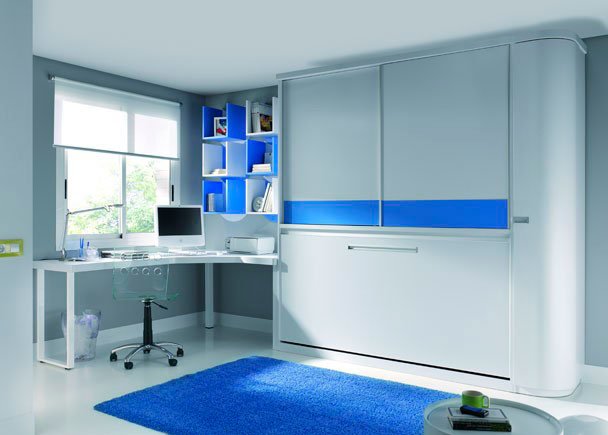Room with fold-down bed, upper sliding wardrobe, curved terminal wardrobe and L-shaped study table with white legs.