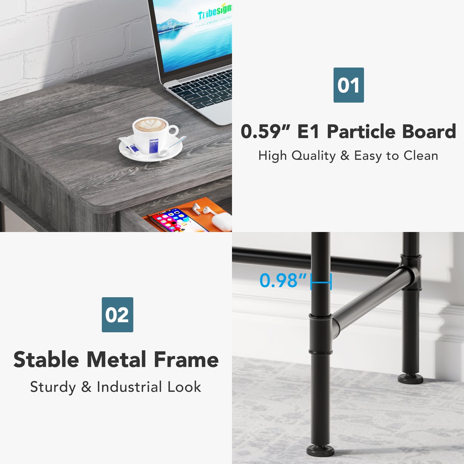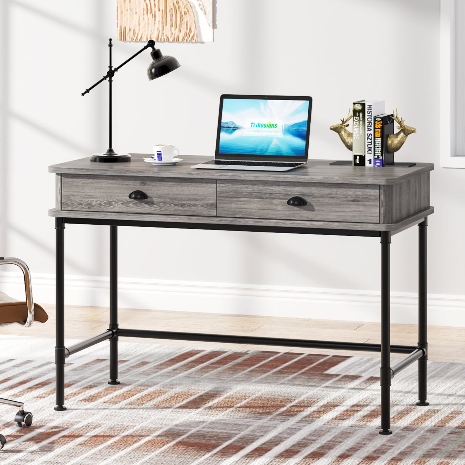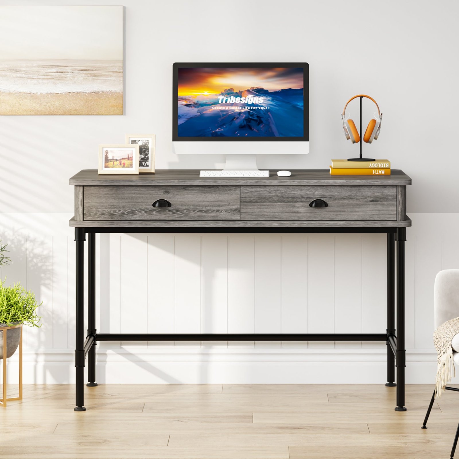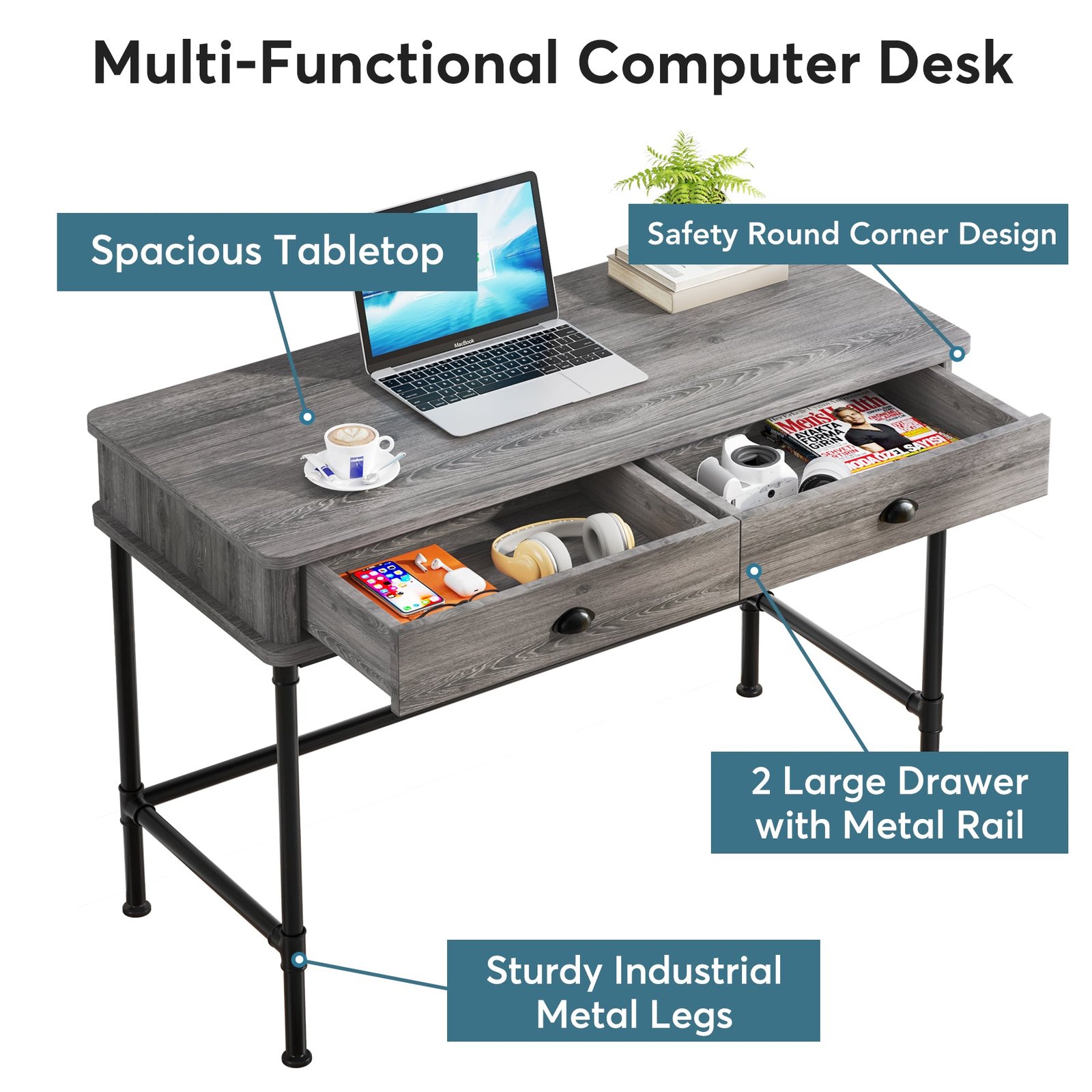 Minimalism Industrial Computer Desk ? With industrial simple and open, safety round corner design, this gray computer desk with 2 drawers brings a feel of minimalism to any room? making your home office space look neat, rustic, and comfortable. Create a more comfortable working area for work, homework, writing, or gaming.