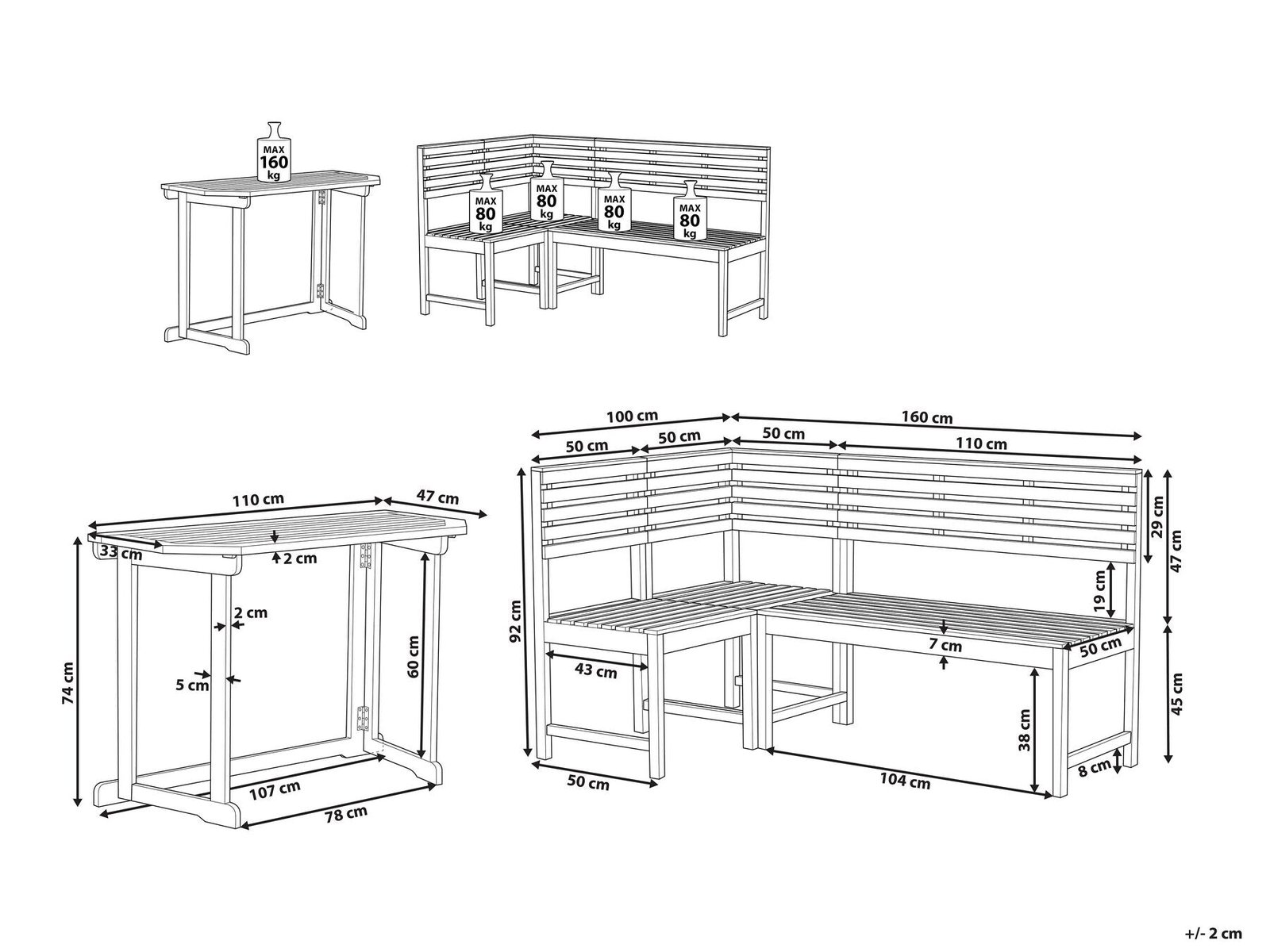 Width 160 cm – Depth 100 cm – Height 92 cm