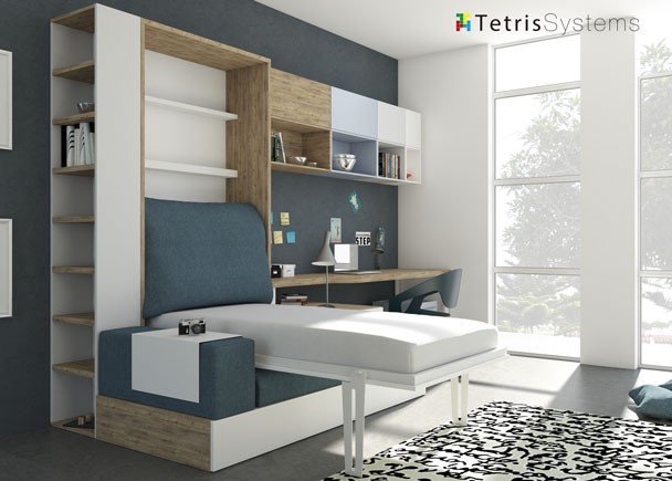 Youth room with vertical folding bed with DIVO sofa supported on a trundle base with a pull-out bed base. It has a study area and a terminal bookcase.
