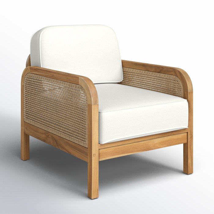 Coastal style meets mid-century modern inspiration in this 28” armchair. Crafted from solid teak wood, it showcases round arms with cane-webbed panels and a natural wood grain finish that complements the two ivory olefin cushions. Each cushion is filled with foam for a padded feel, while the UV-resistant material helps protect against fading. With a weight capacity of 250 lbs., this chair is designed for leisurely outdoor lounging. To keep it looking its best, store indoors or cover when not in use. Embrace the beachy vibes and enjoy your time outdoors in this inviting armchair.