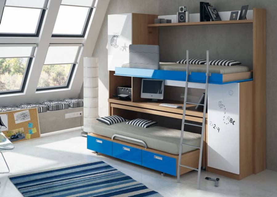Youth bedroom with practical, foldable and self-supporting compact furniture.