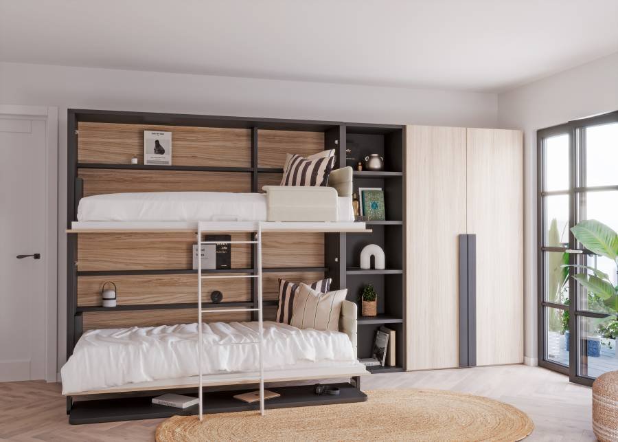 Discover a smart solution for small rooms. Our horizontal folding bunk bed with integrated desk is ideal for maximising space