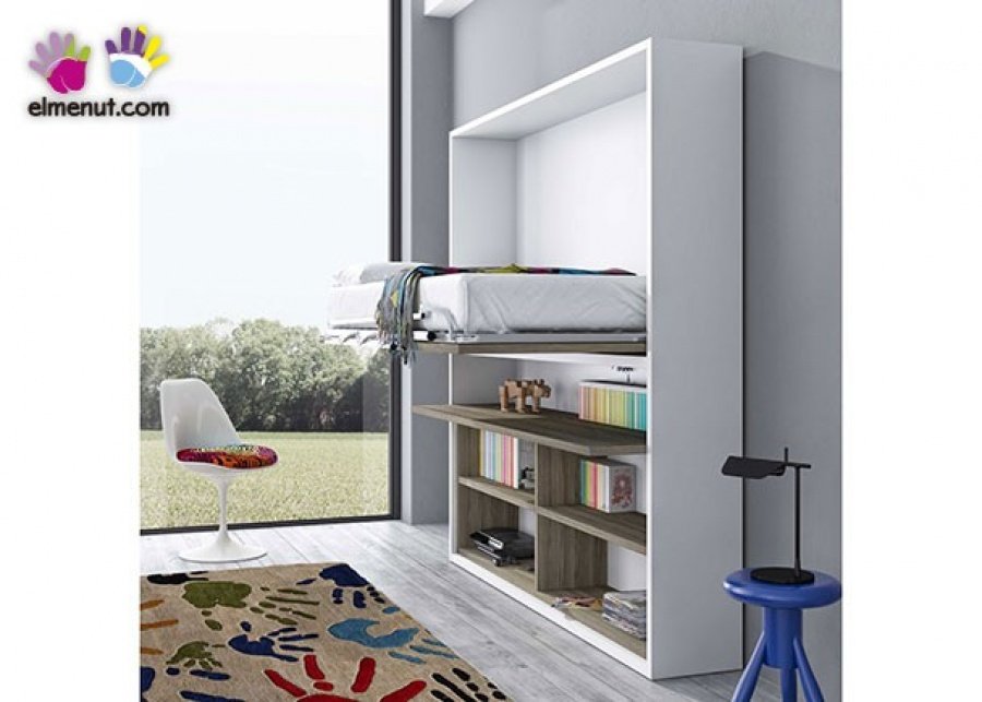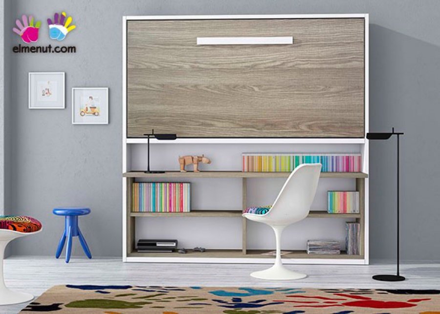High horizontal folding bunk bed with desk, for 90 x 190 mattress. Slatted base included and synchronized railing and ladder.