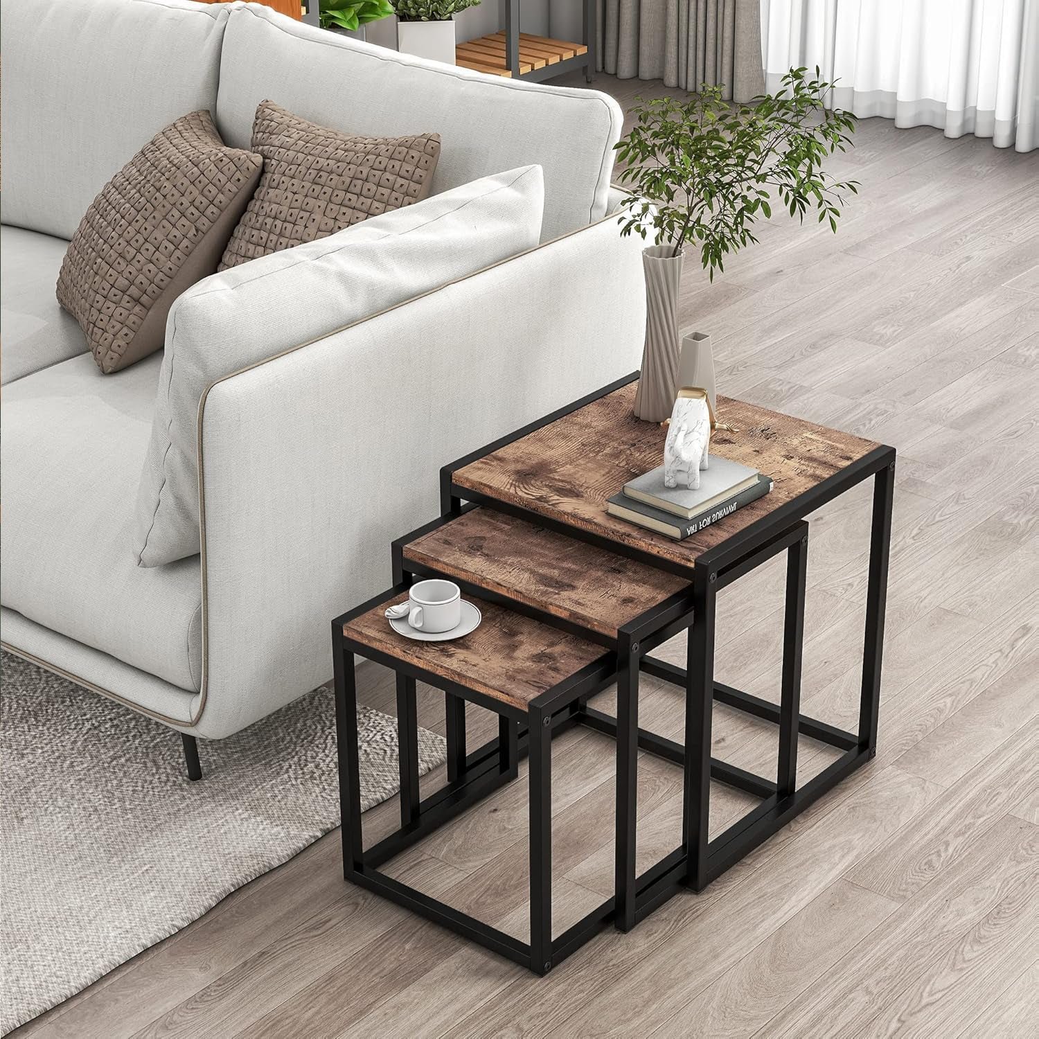 This elegant side table set by Oscar Ratan combines warm wooden surfaces with sturdy metal bases, adding a modern and versatile touch to any interior space.