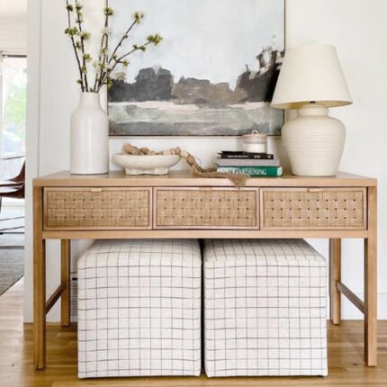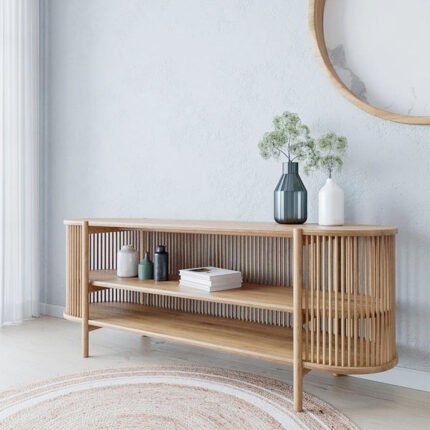 Style: Half-moon. This is a unique console table design that creates a curved silhouette against the wall. Some people also call this a demi-lune table.