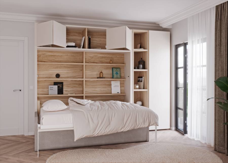 The Murphy bed with sofa creates a versatile space, ideal for work, relaxation and rest. The built-in wardrobe keeps simplicity and organisation at the heart of the design. Customise every detail to suit your vision of a contemporary Nordic space, where functionality meets aesthetics in perfect harmony. A study that not only inspires creativity, but also embraces Scandinavian comfort in every detail.