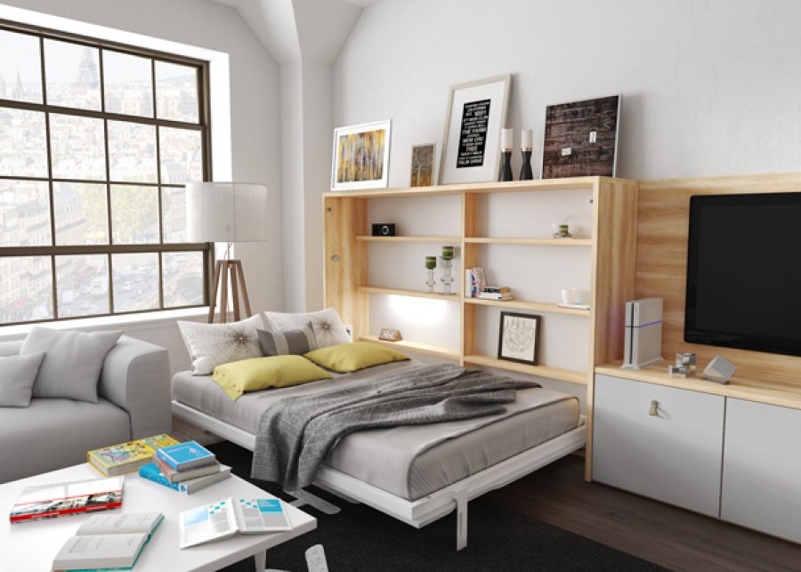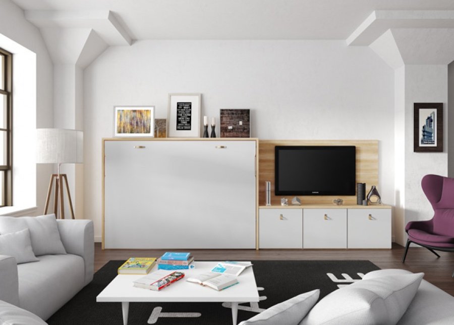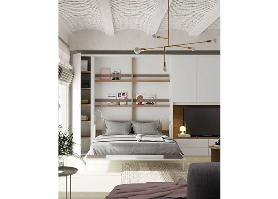 This time, the folding bed leaves the bedroom to sneak into the living room , with a composition that includes a folding bed and low TV modules. The folding beds from Tetris System are so versatile that they adapt to any space.