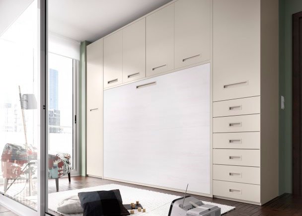Horizontal folding double bed (135 x 190) with two side wardrobes (one of them with a 6-drawer chest of drawers) + 4-door loft