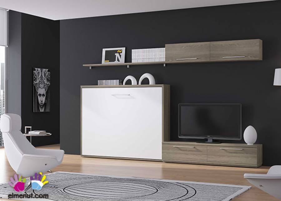 Living room with horizontal folding bed for a 150 x 190 mattress with wall composition. It has a 98 cm low TV module, a 206 cm wall shelf and two hanging modules with a lift-up door.