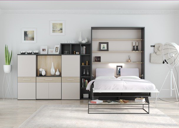 The NORDIK is a folding system (vertical or horizontal) with a sofa , for double beds , with different depths and mattress dimensions, which you can personalize by choosing both the finish tones of the furniture and the textile colors . In addition, it is a self-supporting piece of furniture so it is even suitable for plasterboard walls.