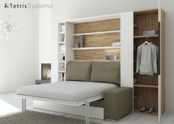 Living room as a fold-down bed for a 150 x 190 cm mattress, plus a sofa and a trundle bed. A 29 cm wide front bookcase and a 29 cm wide wardrobe on the right with a fixed wall and a 60 cm swing door. The whole set has a depth of 45 cm and the fold-down bed folds down 221 cm from the wall when open. In the lower part we find a trundle bed measuring 80 x 190. Total dimensions of the set: 289 x 45/221 x 232.5 cm.