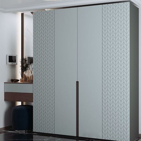 The wardrobe is large and has a chevron pattern on the doors. The chevron pattern is created by reversing the direction of the wood grain in alternating sections. The wardrobe has a metal base and two doors.