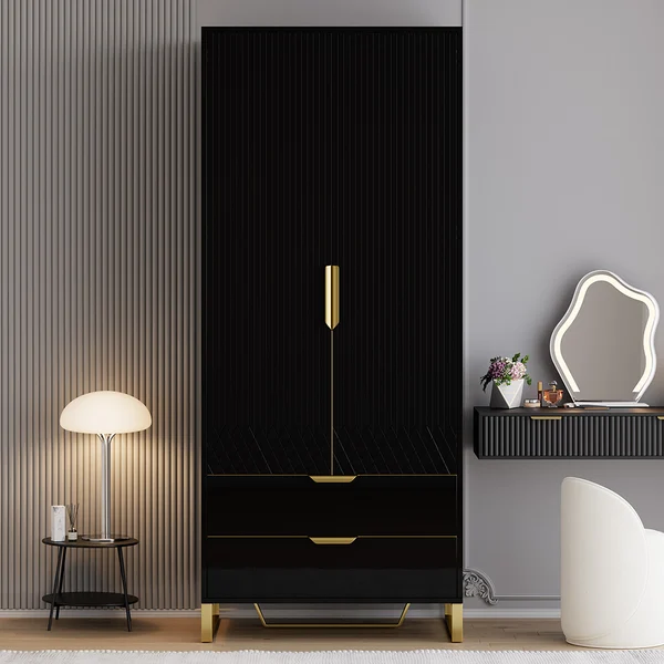 Bring this Mavina Wardrobe home to light up your clothes storage space in a bedroom, no matter how much clothing collection you have or how much space you possess. This premium yet lasting quality piece will make a statement in any home area. Features with a gold pull and black appearance, which look classic and elegant in your living room or bedroom It lends a modern feel to any area and also adds a touch of lifestyle for modern life. The clothes rail helps to keep your coats or dresses away from being crumpled.