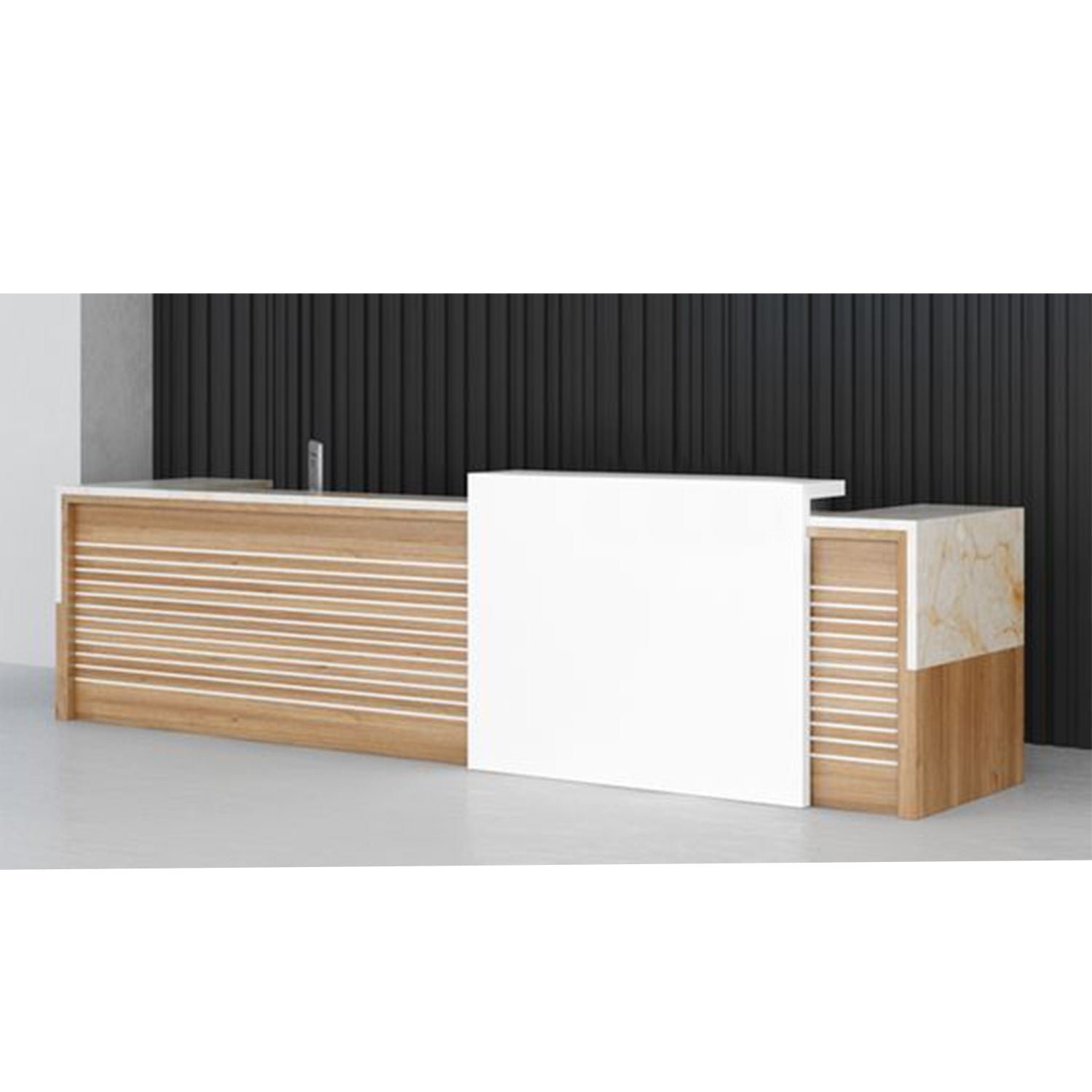An elegant reception counter made of luxurious Spanish MDF wood, featuring a smooth and matte finish that gives it a modern and elegant character. The warm colors of the wood complement its simpdesign lines, providing a professional and attractive look. Its spacious surface has plenty of room for desk tasks, with hidden storage keeping things tidy and organized. Perfect for making a welcoming first impression in any modern office environment.