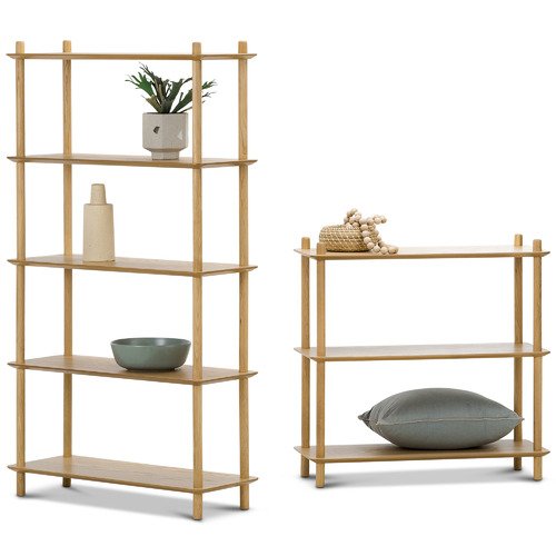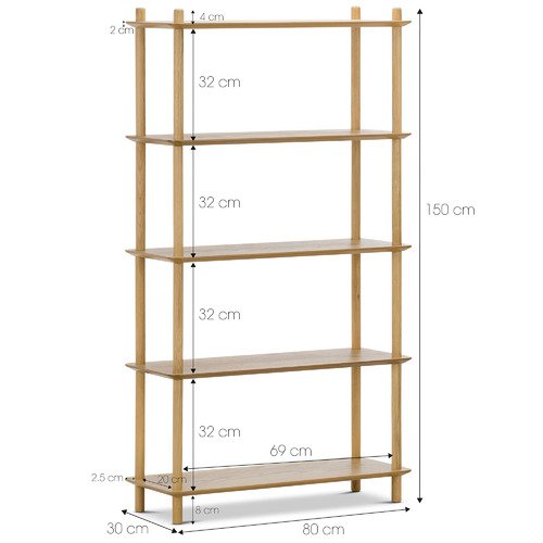 Materials: MDF shelves with oak veneer, solid oak frame