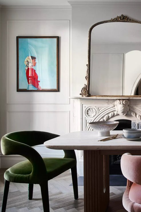 This round table features a white marble top with a smooth, polished finish. The veins in the marble add a touch of natural pattern to the table.
