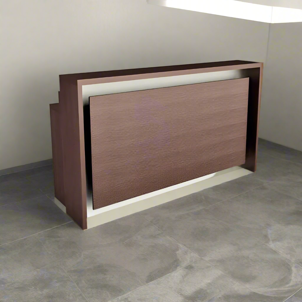 An elegant reception counter made of luxurious Spanish MDF wood, featuring a smooth and matte finish that gives it a modern and elegant character. The warm colors of the wood complement its simpdesign lines, providing a professional and attractive look. Its spacious surface has plenty of room for desk tasks, with hidden storage keeping things tidy and organized. Perfect for making a welcoming first impression in any modern office environment.
