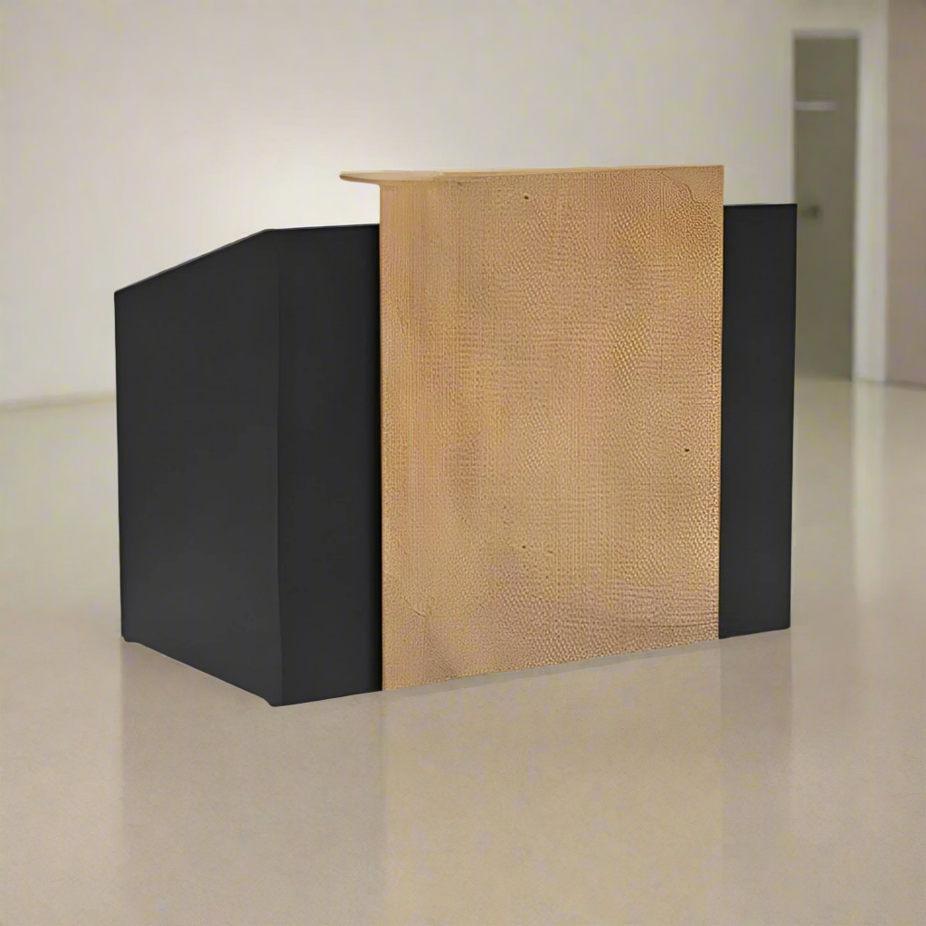An elegant reception counter made of luxurious Spanish MDF wood, featuring a smooth and matte finish that gives it a modern and elegant character. The warm colors of the wood complement its simpdesign lines, providing a professional and attractive look. Its spacious surface has plenty of room for desk tasks, with hidden storage keeping things tidy and organized. Perfect for making a welcoming first impression in any modern office environment.