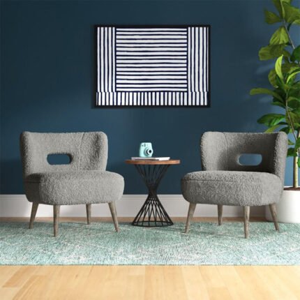 The armchair has a curved back and armrests, and is upholstered in fabric