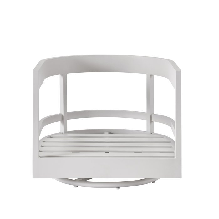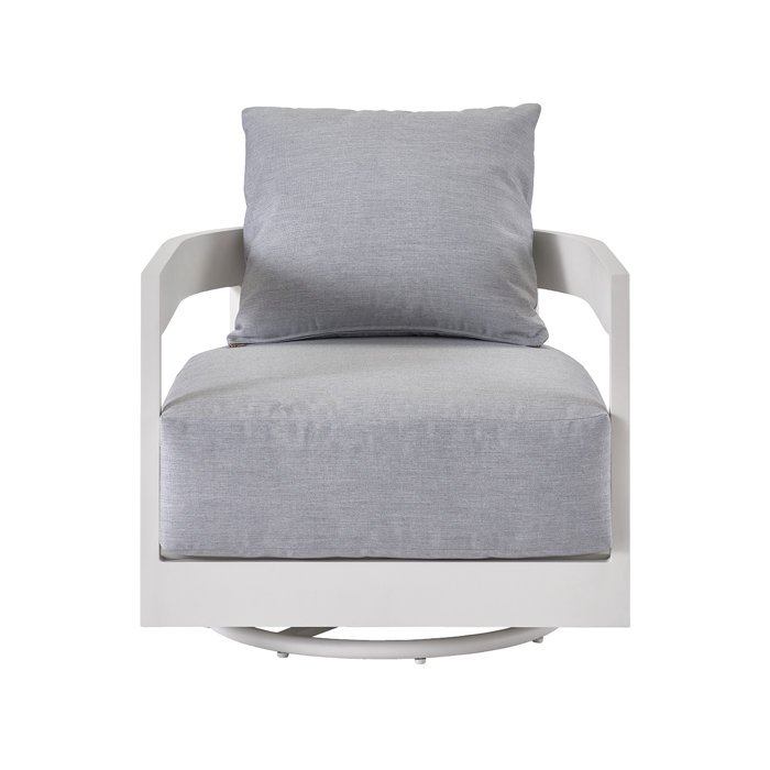 Built atop a convenient swivel base, the Swivel Patio Lounge Chair with Cushions introduces a casual elegance to outdoor living spaces with light gray oversized seat cushions perfectly complemented by a fresh white-hued aluminum body with a subtle curvature.