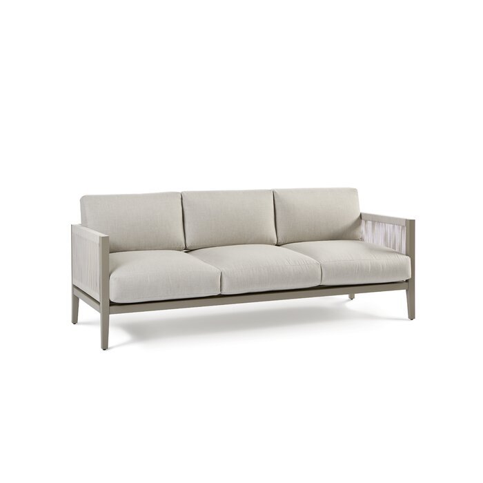 Enjoy a la carte dining in comfort and style with this 3-person patio sofa. This sofa sits on a powder-coated aluminum frame with a graystone finish. The seat and back have weather-resistant, removable-cover Sunbrella seat and back cushions with foam fill ? and since they come in your choice of color, this sofa is easy to pair with both vibrant and monochromatic color palettes. Plus, the sides of the sofa are strung with nautical rope for a touch of coastal charm.