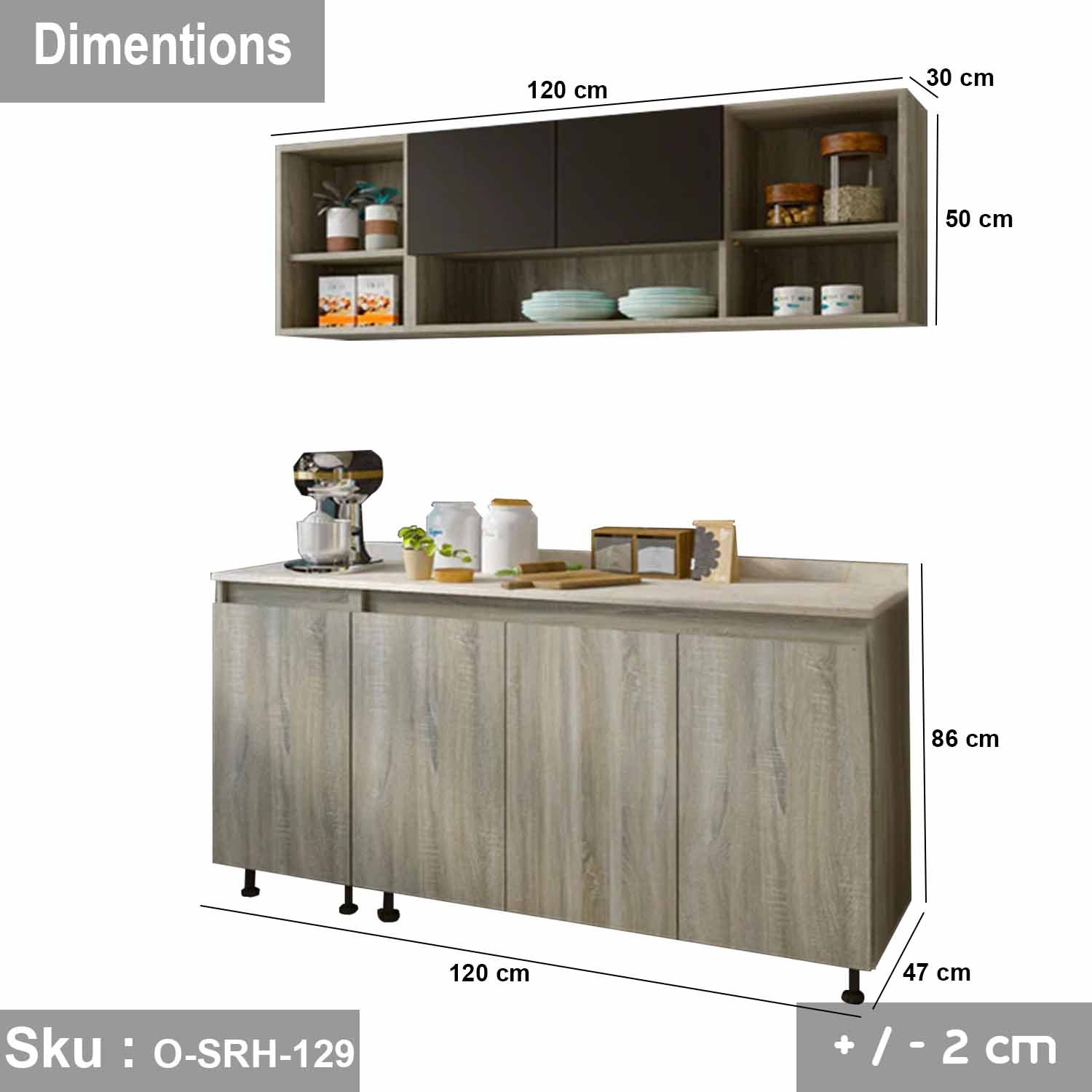 Upper unit size: width 120 cm – depth 30 cm – height 50 cm