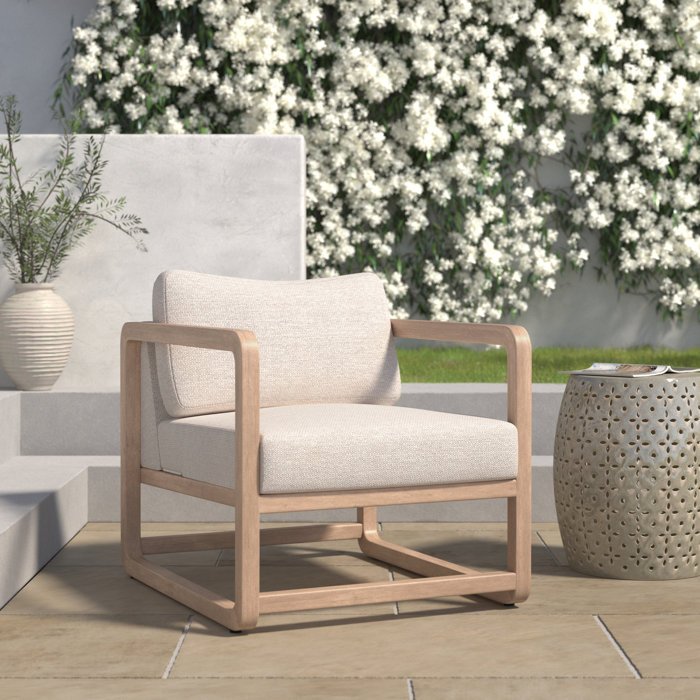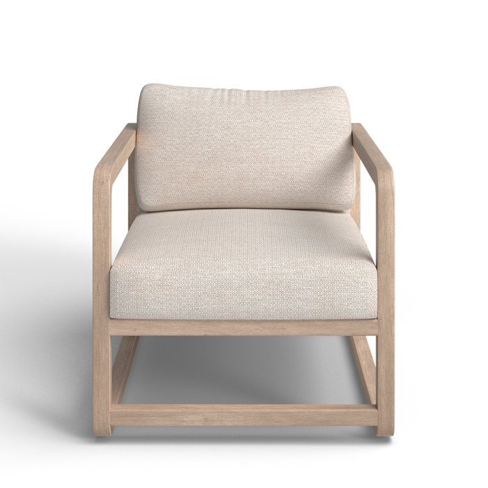 Washed brown Forest Stewardship Council? (FSC?) 100% certified teak forms rounded corners for a novel take on open, angular framing. Upholstered in an invitingly neutral sand, this outdoor-friendly seating style layers in with total ease. Cover or store indoors during inclement weather.