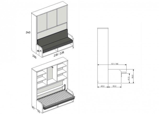 Two side bodies with interior shelves and a central space with a removable hanging bar (especially for 45 cm deep wardrobes).