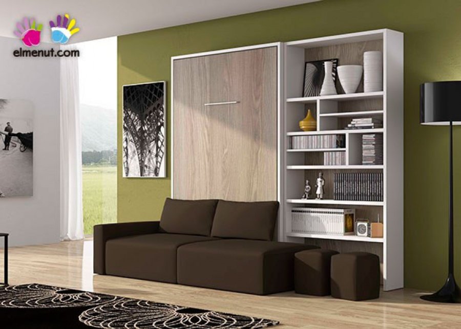 Living room with a vertical folding double bed, for a 150 x 190 mattress, with an integrated sofa. The space is completed with an asymmetric bookcase.