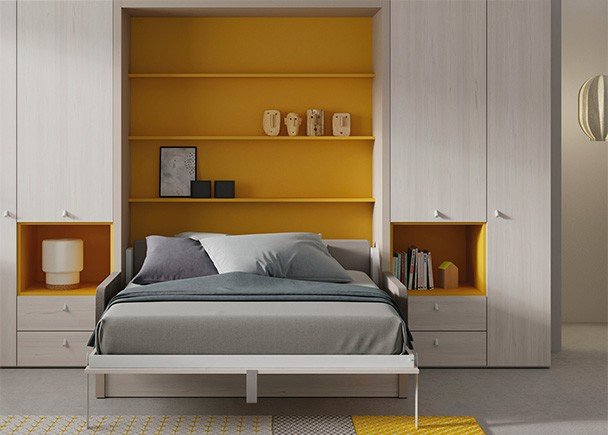 Living room-bedroom equipped with a vertical folding bed with a sofa and a wardrobe area. The composition has been planned symmetrically, with the bed in a central point and the wardrobes distributed on both sides. The two wardrobes closest to the bed have been designed so that the decorative space and the drawers can serve as a bedside table. The rest of the elements are for storage.