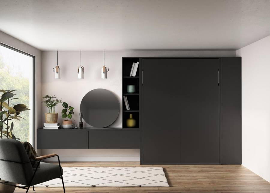 This composition is ideal for a home office … The room features a vertical folding double bed with interior shelves, a one-door wardrobe and a bookcase supported by hanging modules with storage. The dark finish highlights the details of the shelves resulting in an elegant and sophisticated space . When the bed is not in use, the rest of the room can be used for different activities , as it remains quite clear .