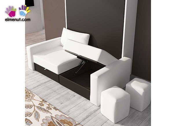 Living room with a vertical folding double bed, for a 150 x 190 mattress, with an integrated sofa. The space can be completed with other elements, such as low modules, hanging units, desks and bookcases.