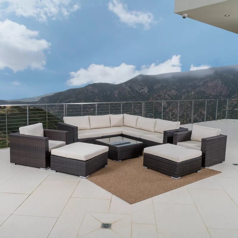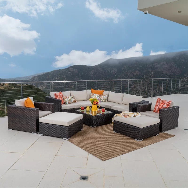 Create a comfortabcorner in your outdoor area. The modern design with the structure made of pure rattan treated for this piece of furniture is sure to decorate your garden, patio, or terrace. The set consists of 2 chairs + 2 poufs + a 3-seat sofa with one shoulder + a sofa, 2 seaters with one shoulder + a taband All components of the bar can be combined or used separately to make the most of the space, ensuring you have side space for your drinks.