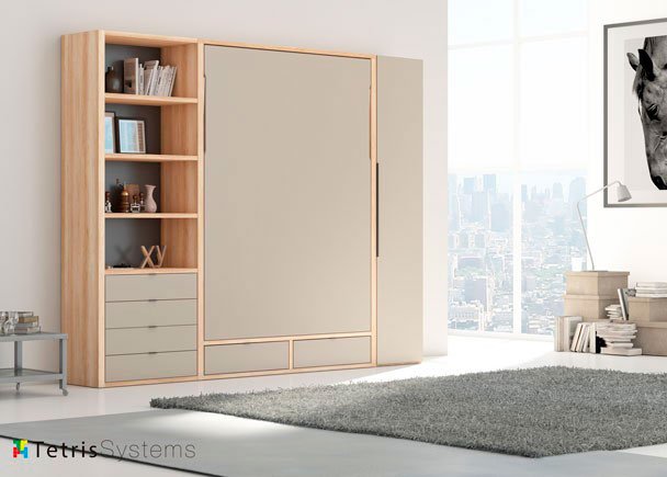 Living room with a vertical folding double bed from the WALLBED series, for a 135 x 190 bed base. The room has been completed with a bookcase in which a 4-drawer module has been housed at the bottom and on the right we have placed a 1-door wardrobe.