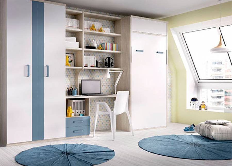 The environment that appears in this scene corresponds to a youth bedroom equipped with a vertical folding bed with an upper loft, for a mattress size of 90 x 190. It comes standard with a slatted base included, and the legs are self-positioning by gravity .