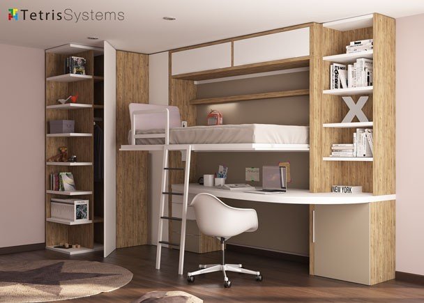 This large table is designed to be able to open the bed and place the ladder without getting in the way. This desk rests on a four-drawer module and at the other end on a door module, on which we can find a generous bookcase that gives us a large storage capacity. This folding system allows us to incorporate large lofts with a depth of 45 cm (the same depth as the folding module ), which together with the corner wardrobe and the terminal , gives us the possibility of housing a large number of elements, whether clothing or bulky items.