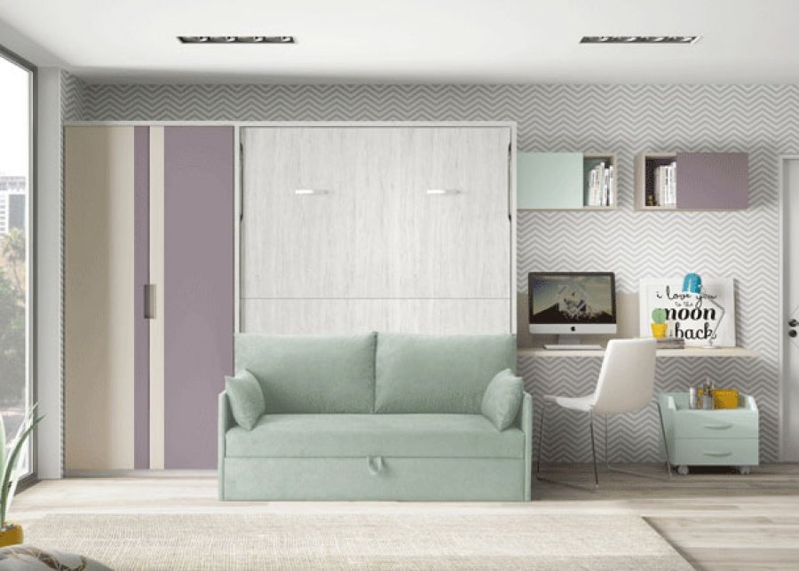 Youth room equipped with a folding bed model with sofa, a 2-door straight wardrobe and a study area.
