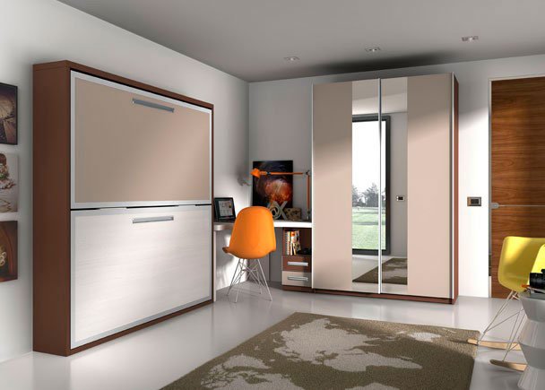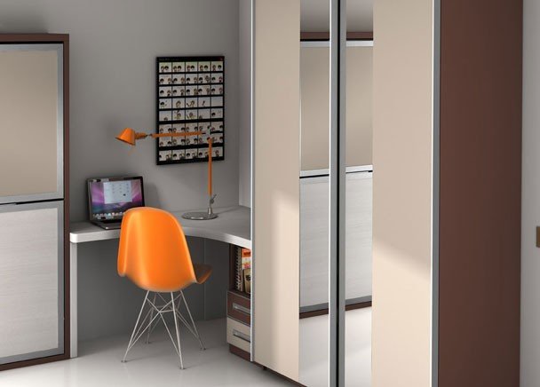 Youth room with a folding bed with metal edges, a study table according to the client’s measurements and a wardrobe with mirrored doors.