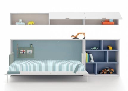 Horizontal folding bed U+D series with low bookcase and wall composition