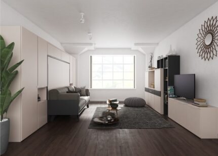 Living room with vertical folding bed with sofa and wardrobe