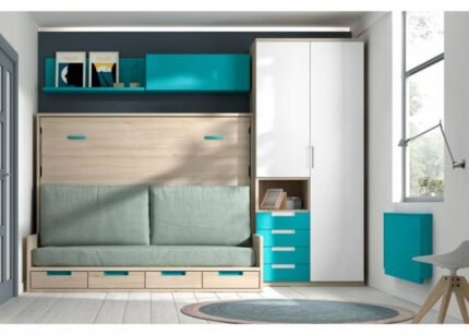 Bedroom-study with horizontal folding bed with sofa and wardrobe.