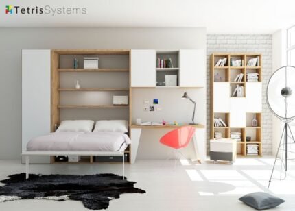 Bedroom with a horizontal folding double bed and study area