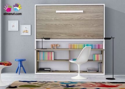 Horizontal folding bed with desk, upper wardrobe and bookcase.